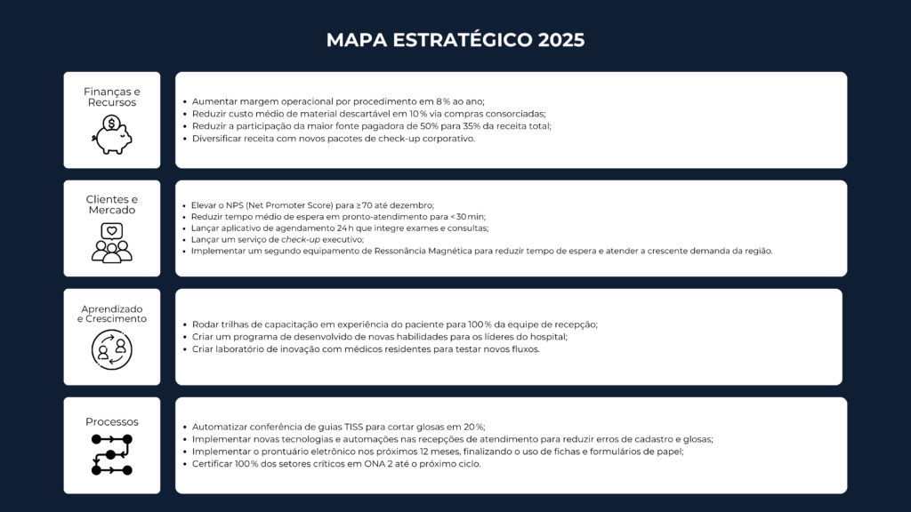O mapa estratégico consolida as decisões críticas da organização em uma estrutura objetiva, conectando metas assistenciais e financeiras à visão de longo prazo.