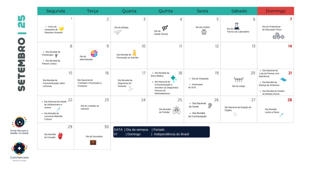 O calendário de 2025 elaborado pela Commerciare gestão e saúde está recheado de oportunidades para clínicas, hospitais, laboratórios, representantes da saúde e profissionais como médicos, psicólogos, fisioterapeutas, nutricionistas e outros a criarem ações que destacam a importância do cuidado com a saúde e fortalecem suas marcas.